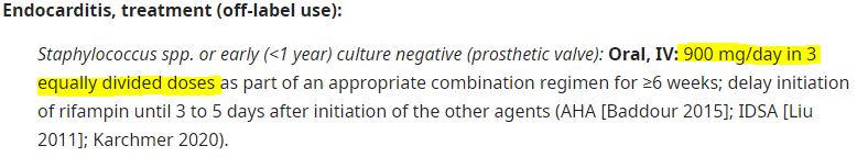 (일부 전문가들은 vancomycin이 심장의 vegetation에 적절히 침투하고 rifampin의 치료 후 내성 방지(prevent treatment=emergent resistance to rifampin)를 위해 rifampin을 투여를 며칠 연기할 것을 권고하고 있다.)