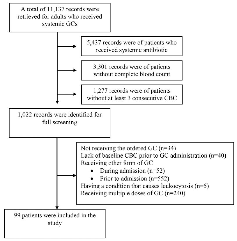 Glucocorticoids (GCs) may cause leukocytosis through several mechanisms. The objective of this study was to examine the impact of a single-GCs dose on total white blood cell (WBC) count, absolute neutrophil count (ANC), and absolute lymphocyte count (ALC) in hospitalized adults without bacterial infections.